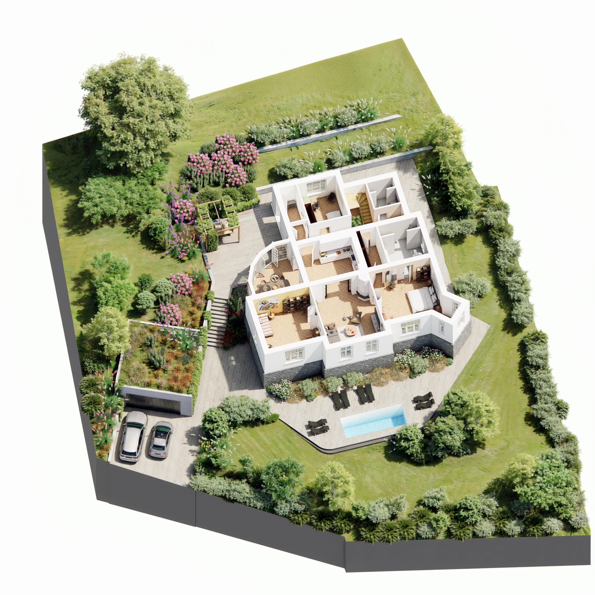 Na vyžiadanie sú k dispozícii aj profesionálne videovizualizácie od renomovaného zahraničného architekta, ktoré detailne ukazujú možný finálny vzhľad vily aj pozemku.