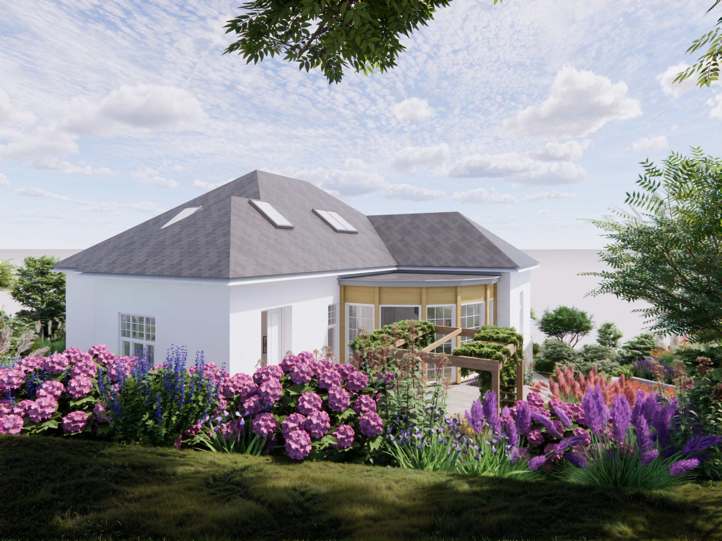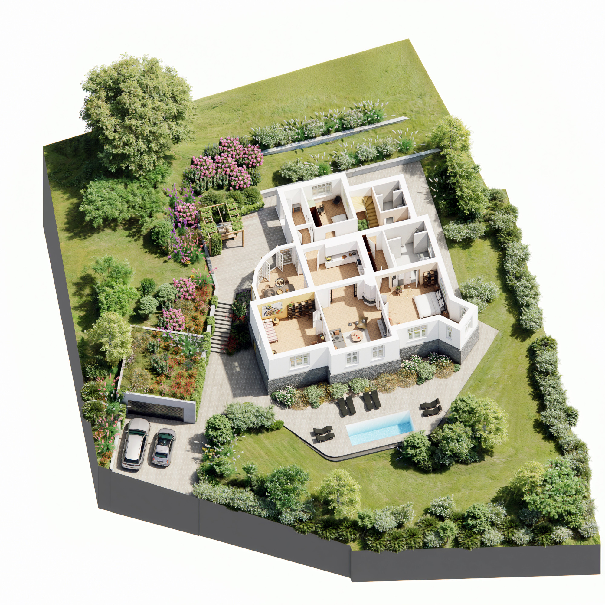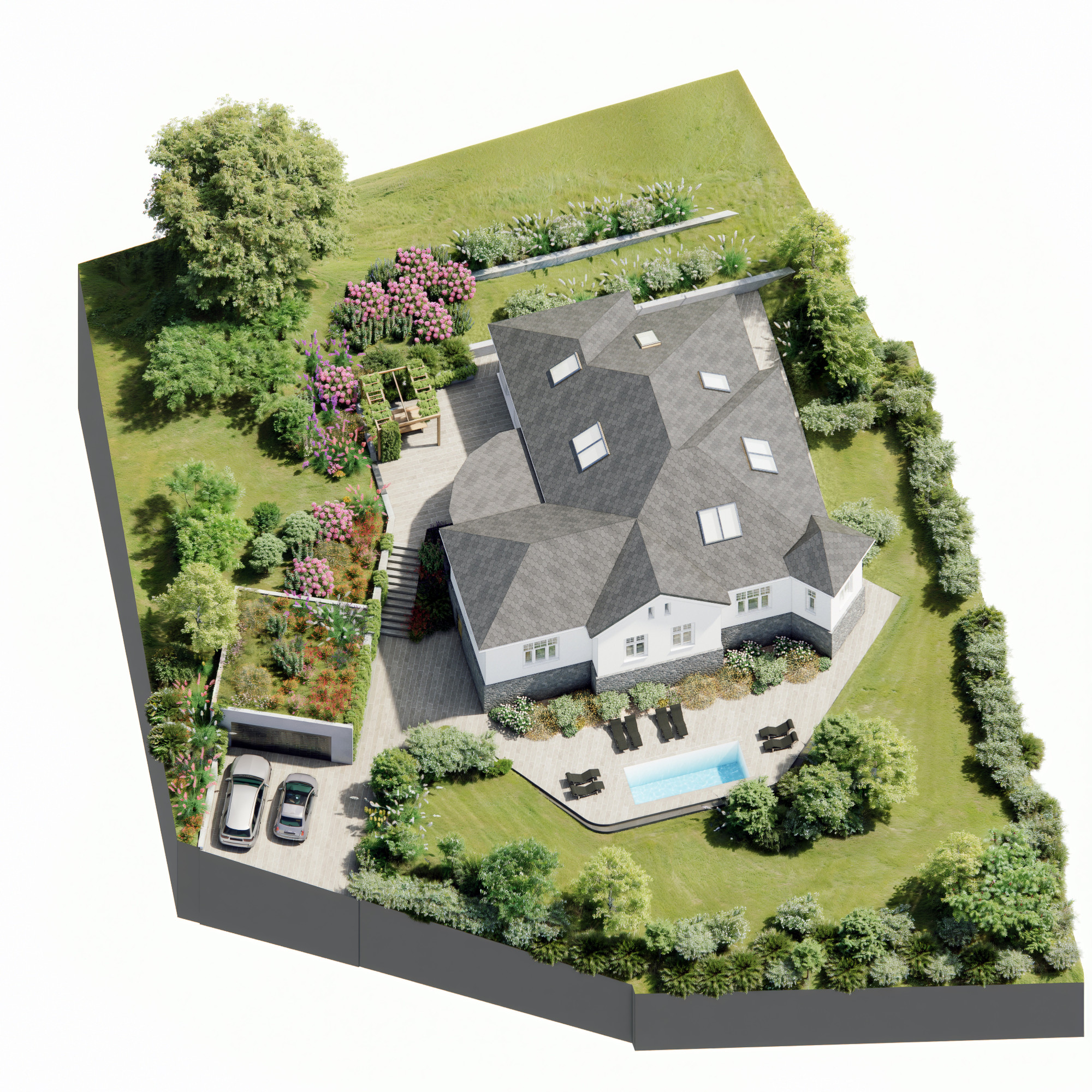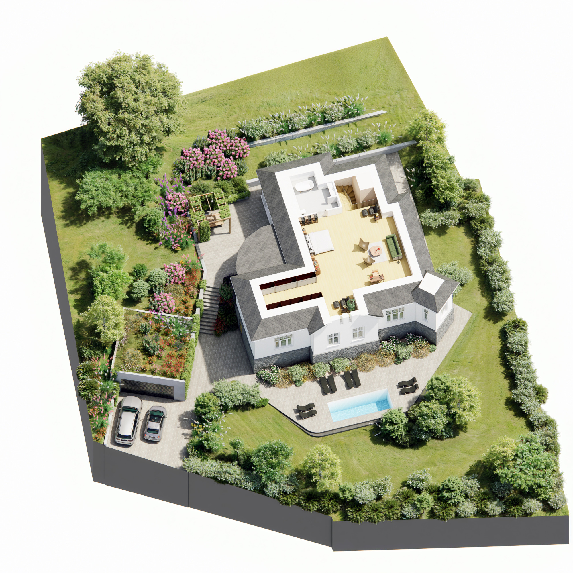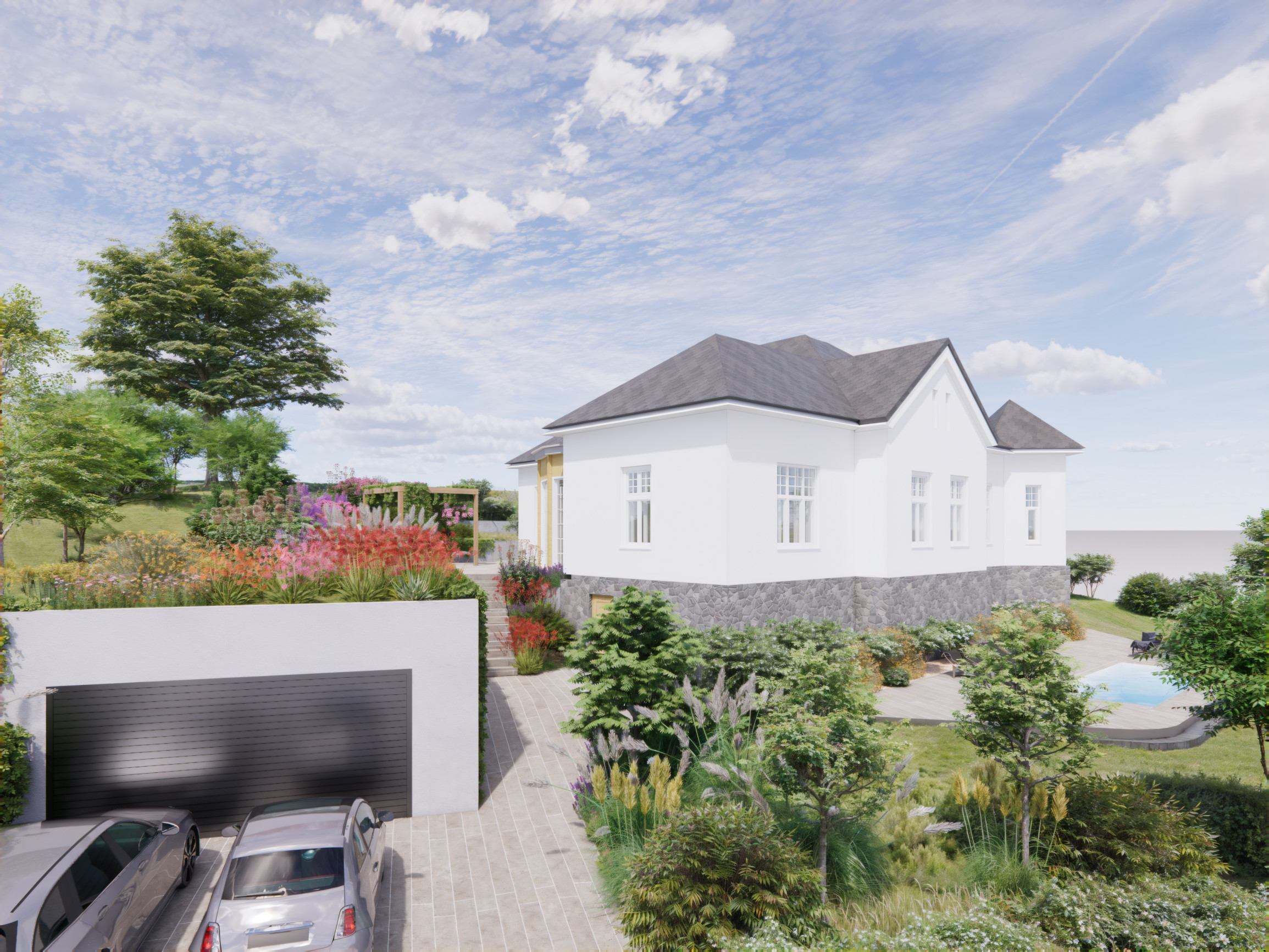 Pre vilu boli pripravené aj profesionálne vizualizácie od renomovaného zahraničného architekta, ktoré ukazujú možný finálny vzhľad domu aj záhrady.