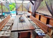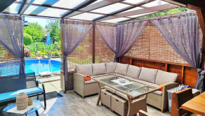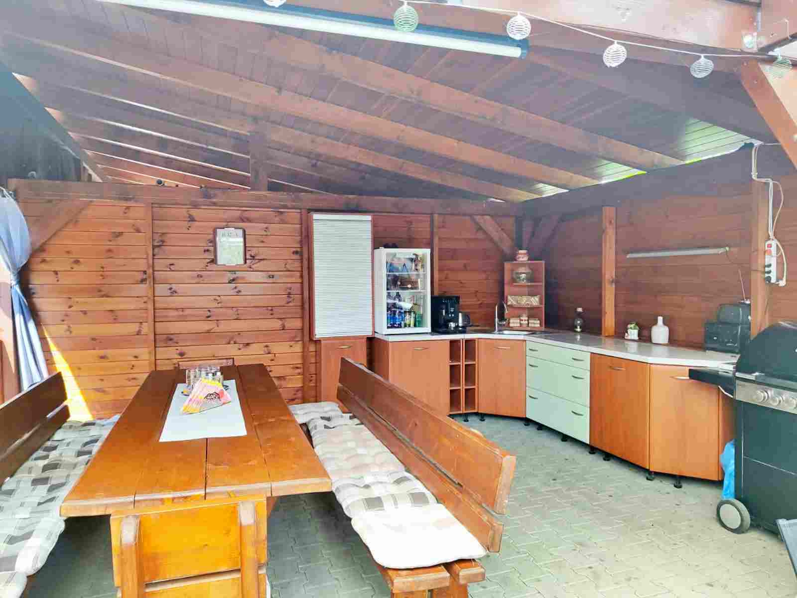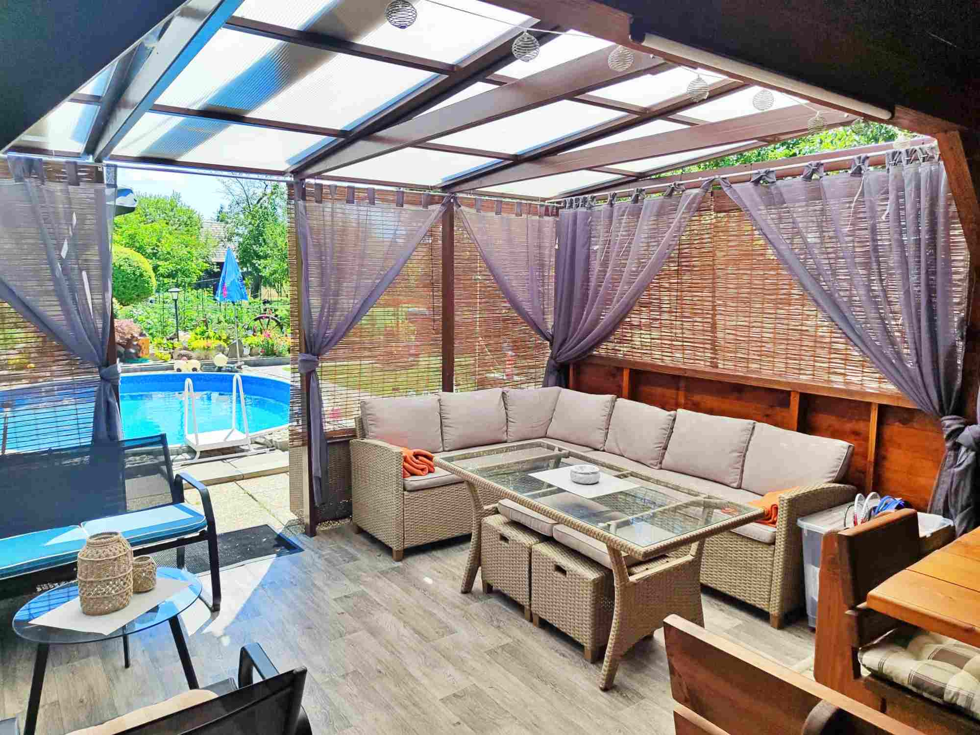 Altánok priamo pri bazéne vytvára ideálne miesto na letné posedenia, grilovanie a rodinné oslavy.
